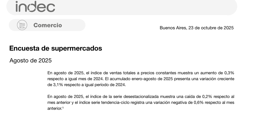 El total de ventas relevadas en la Encuesta de Supermercados alcanzó los $2.107.204,4 millones, un incremento nominal del 33,6% frente a agosto del año pasado, por debajo de la inflación interanual del 31,8%.