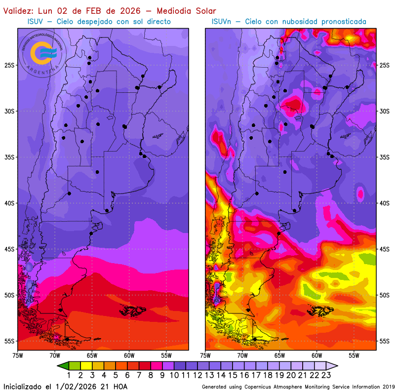 Según el mapa del SMN para el mediodía solar del lunes 2 de febrero, los valores superiores a 11 indican peligro para la piel y los ojos incluso con exposiciones breves.