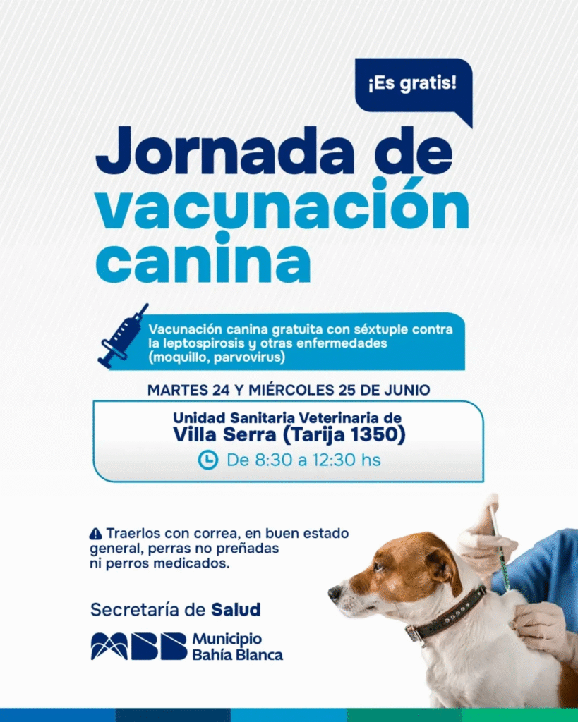Los días martes 24 y miércoles 25 de junio el Municipio de Bahía Blanca realizará una jornada de vacunación gratuita para perros.