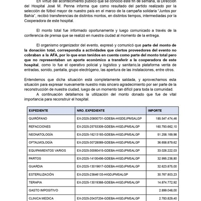 En el mismo se confirma que el dinero recaudado durante el partido solidario “Juntos por Bahía” fue transferido “en tiempo y forma”.