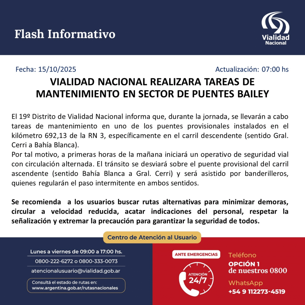 El tránsito será desviado hacia el puente provisional del carril ascendente (Bahía Blanca – General Cerri) y estará asistido por banderilleros, quienes coordinarán el paso intermitente en ambos sentidos.