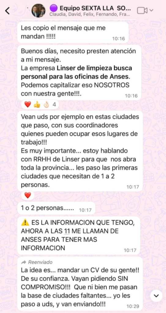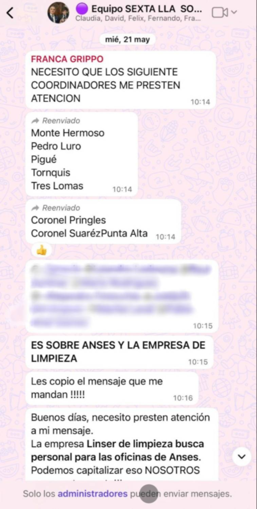 Además, la armadora propuso “colar gente en la ANSES” a través de la empresa de limpieza Linser, como parte de una estrategia para capitalizar recursos estatales en favor de la campaña.