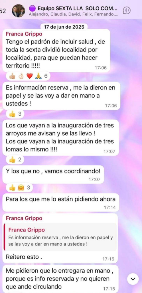 El 17 de junio de 2025, Grippo compartió en un grupo de WhatsApp de la campaña libertaria en Bahía Blanca que tenía en su poder el padrón de Incluir Salud, dividido localidad por localidad, para “hacer territorio”.