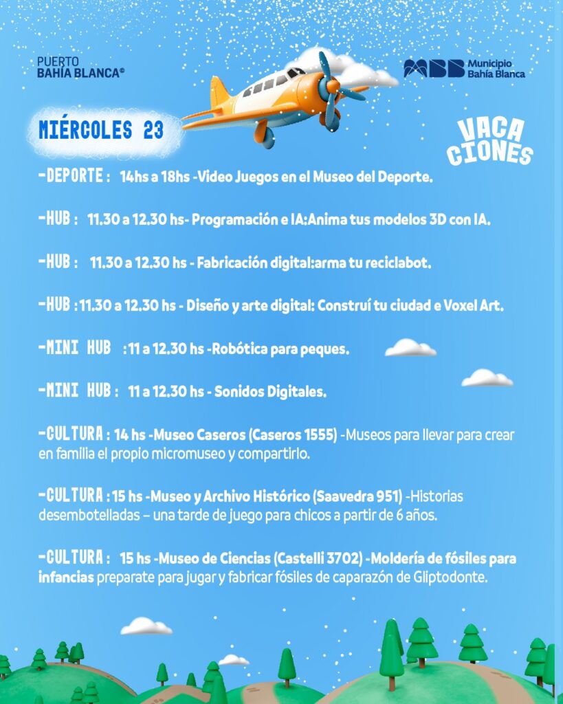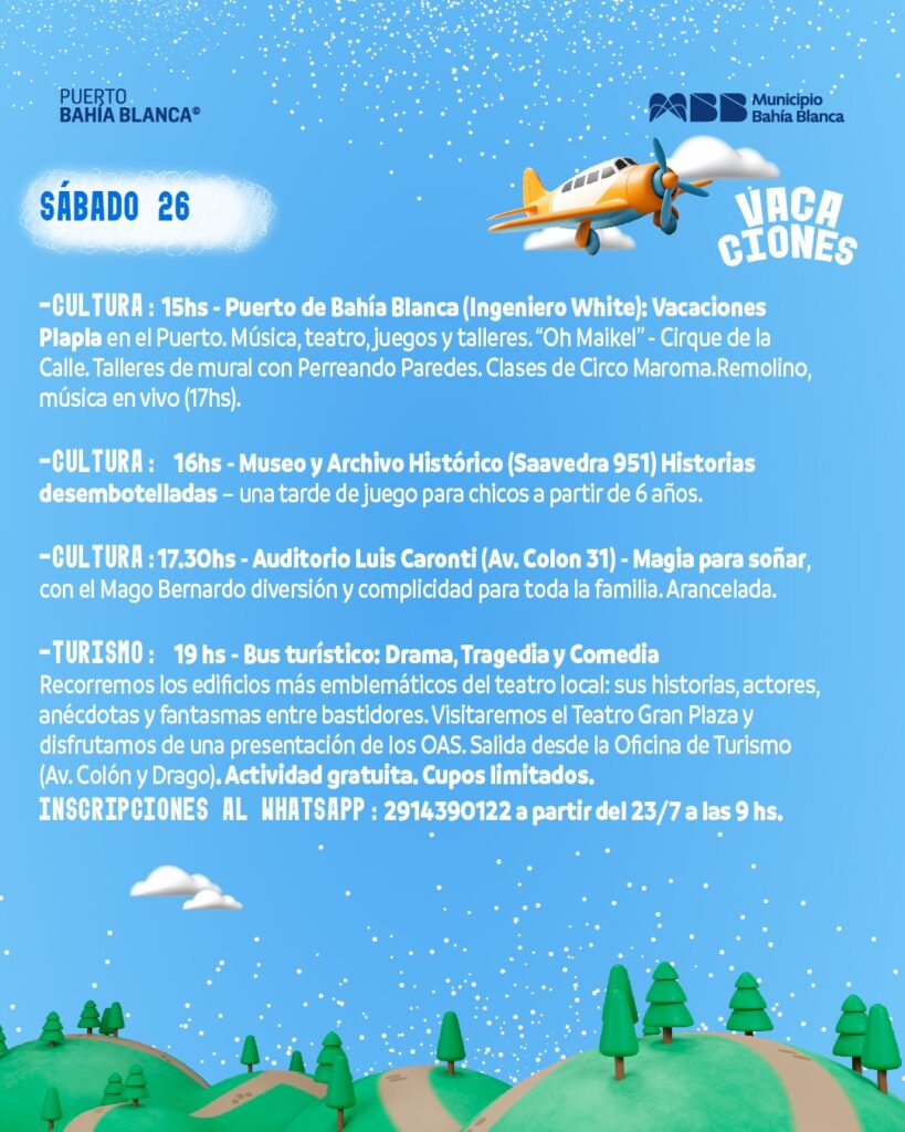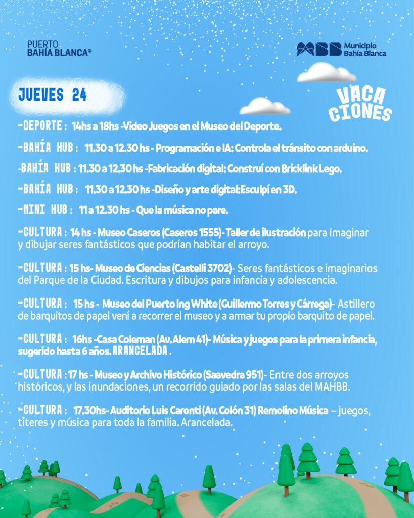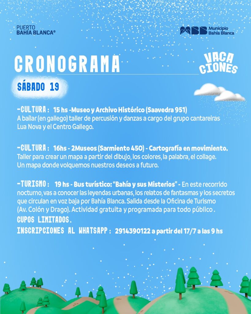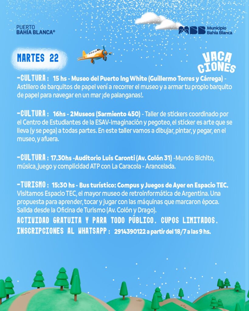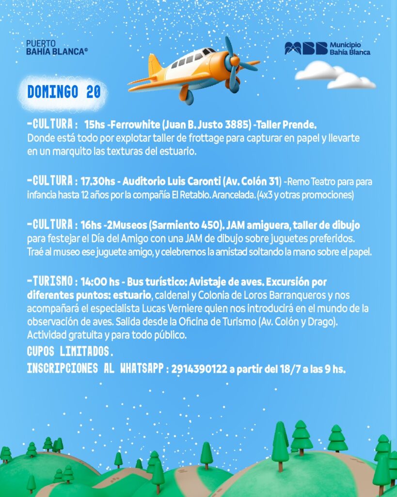 Desde talleres, visitas a museos, excursiones al estuario y múltiples salidas del bus turístico se trata la diversa propuesta. Se debe tener en cuenta que algunas propuestas tienen upo limitado y se debe realizar una inscripción a los números que se encuentran en las imágenes.