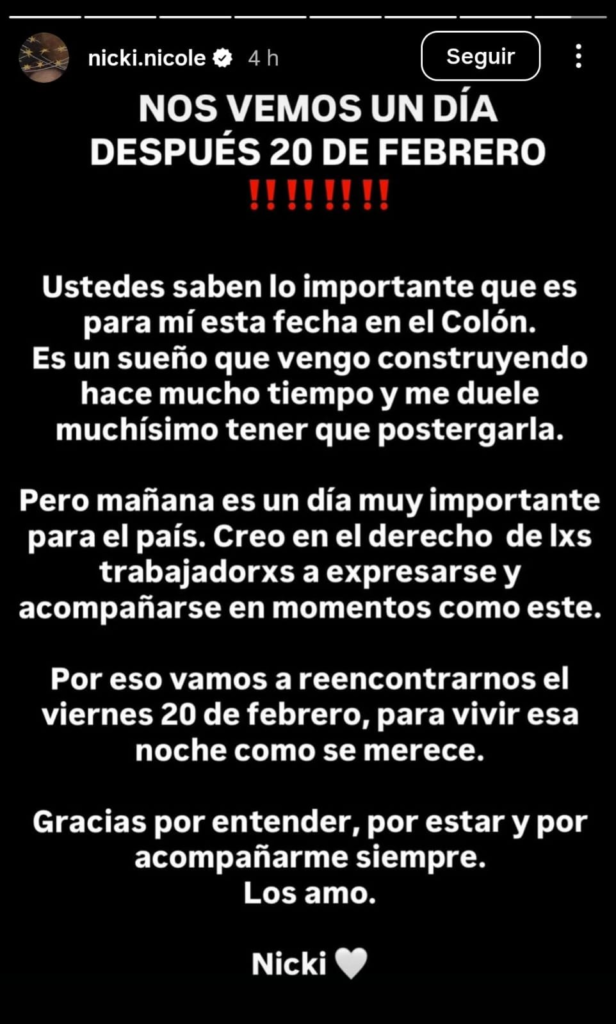 En sus redes sociales aclaró que el show será exactamente el mismo, solo con un día de diferencia, y explicó que el teatro no contará con personal operativo durante la jornada de paro.