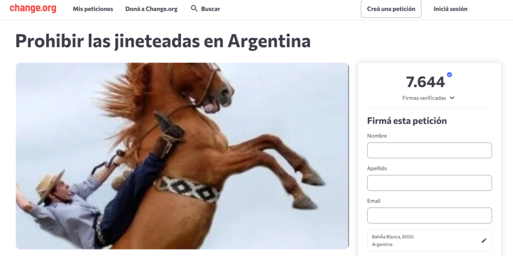 Una petición ciudadana en Change.org titulada “Prohibamos las jineteadas en Argentina” busca poner fin definitivo a esta práctica, denunciada como maltrato animal disfrazado de tradición.