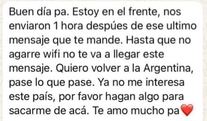 “Estoy en el frente de batalla. Quiero volver a la Argentina pase lo que pase. Ya no me interesa este país. Por favor hagan algo para sacarme de acá”, fue el mensaje que recibió su padre desde Ushuaia en la madrugada del lunes.
